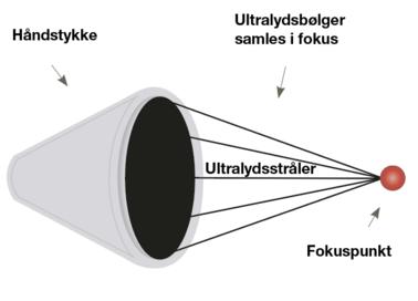- Udstyrets håndstykke udsender bølger af ultralydsenergi mod hinanden til et bestemt fokuseret punkt. Denne udformning forhindrer bølgerne i at krydses inden de målrettet når kontaktpunktet i en dybde af 3–4,5 mm.