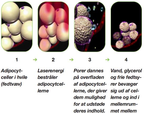 Under behandlingen holder du siddende selv den specielle laser-probe under hagen i 6–12 minutter. Ved denne påvirkning frigiver fedtcellerne deres indhold, uden at det omkringliggende væv bliver påvirket. For at fremme processen placeres 2 lymfeprober tæt ved kravebenet. Under behandlingen bæres specielle briller mod laserlys.
